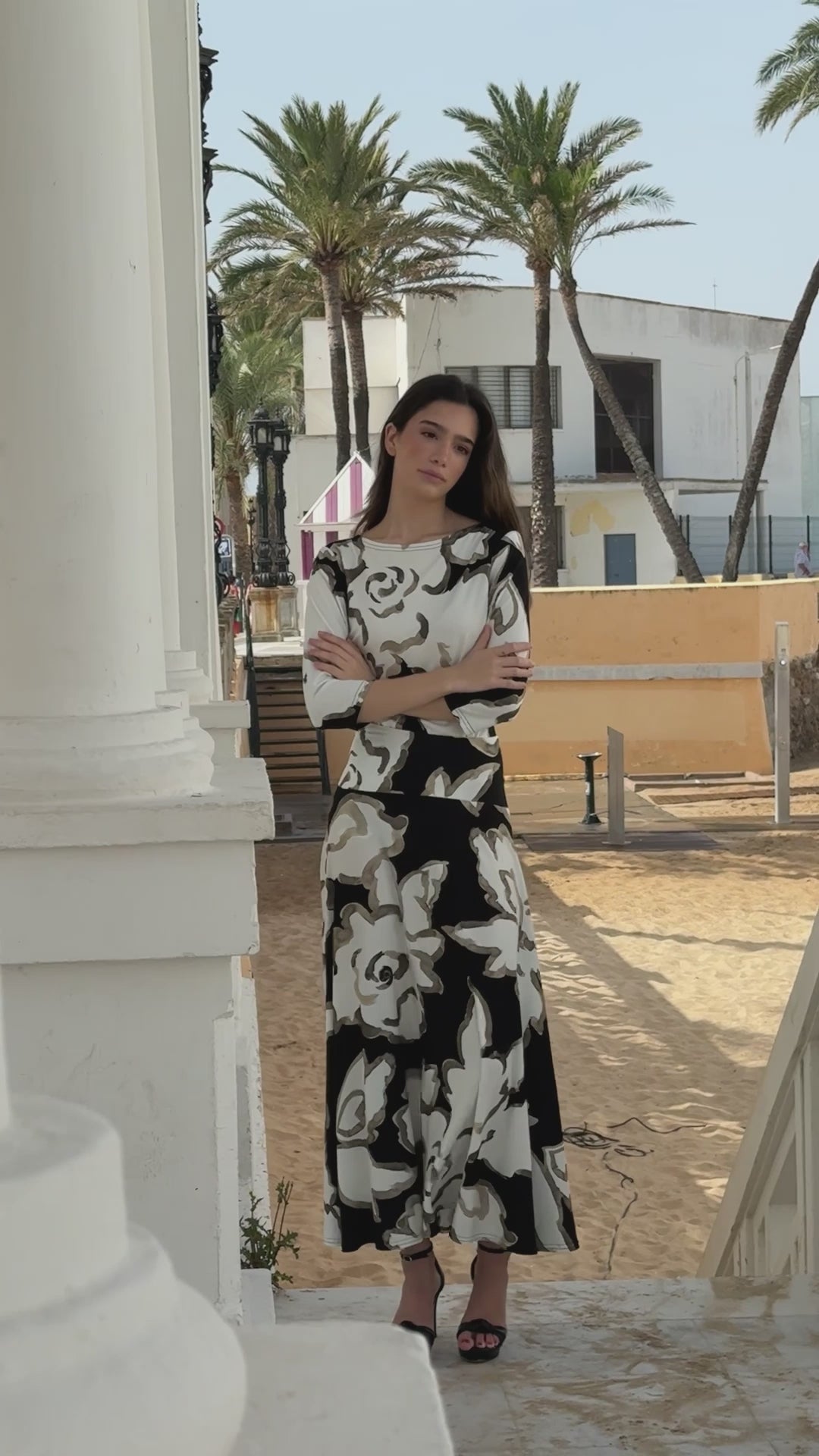 La manga francesa y el escote barco equilibran la silueta. Según cómo lo combines, puede tener un aire más relajado o más formal. Ideal con la falda a juego para invitadas de boda y eventos, o con una prenda negra para un look más versátil.